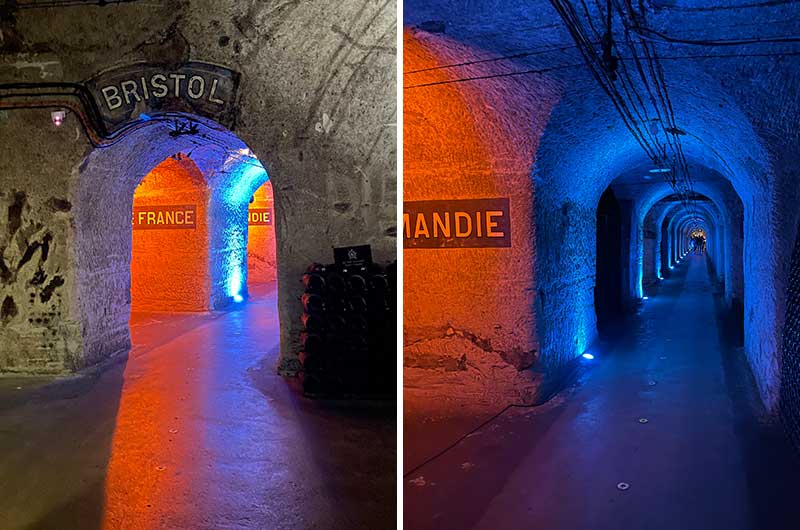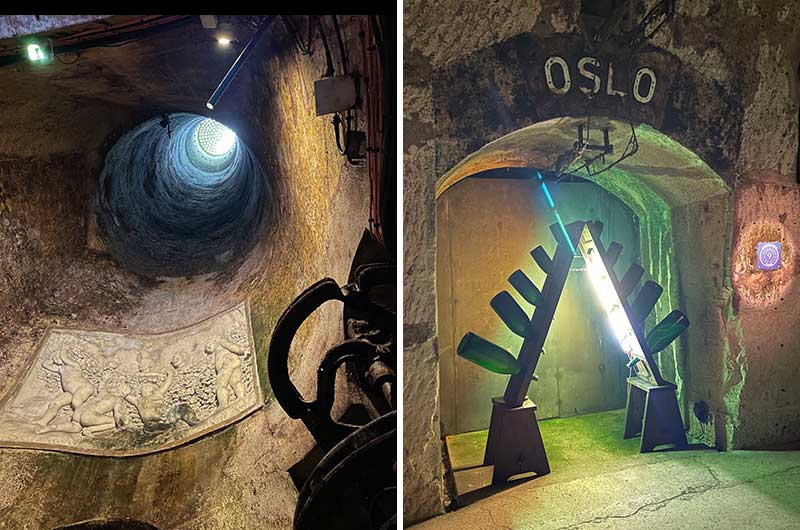 Kjelleren er tretti meter under bakken og i noen av rommene kan man se dagslyset høyt over seg gjennom et lite hull der kalksteinene i sin tid ble hentet ut. Hos Pommery har rommene fått navn etter områder i Frankrike og byer i Europa. Foran inngangen til rommet som heter Oslo, kan man noen av de ulike champagneflaskestørrelsene som finnes.