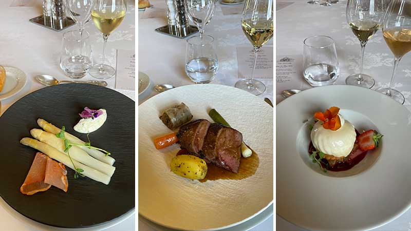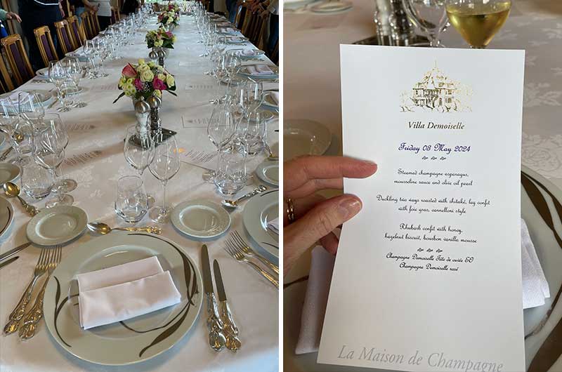 Vi fikk først et glass champagne og kanapeer i første etasje, før vi gikk opp til andre etasje hvor det var dekket på et nydelig langbord for oss. Her ble det servert en utsøkt tre retters lunsjmeny, bestående av asparges til forrett, and til hovedrett og rabarbra med vaniljemousse til dessert. Hver rett ble akkompagnert av et glass champagne.