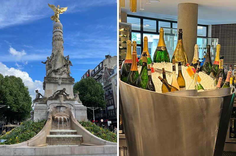 Den vakre Subé-fontainene rett ved Hotel de la Paix i Reims, og til høyre, vinkjøleren i hotellbaren.