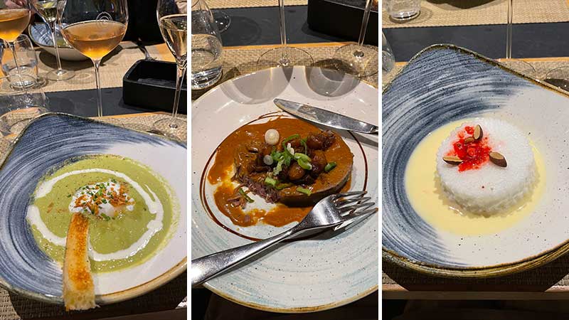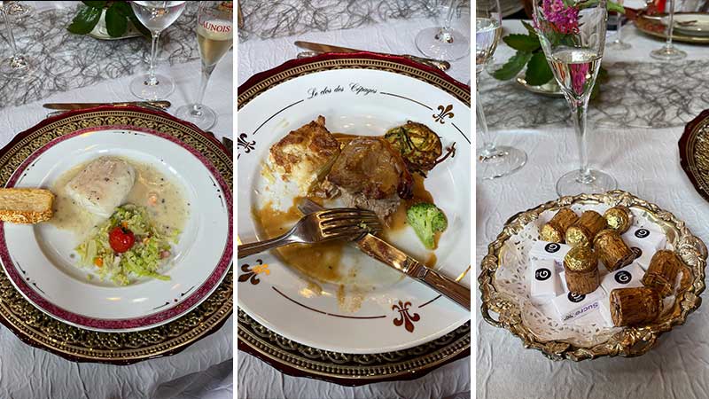Her fikk vi servert tre-retters lunsj med fri flyt av champagne, som ble avsluttet med kaffe og små fylte sjokoladebiter formet som små champagnekorker. Et nydelig måltid og en perfekt avslutning på en opplevelsesrik tur! 🍾 🍾