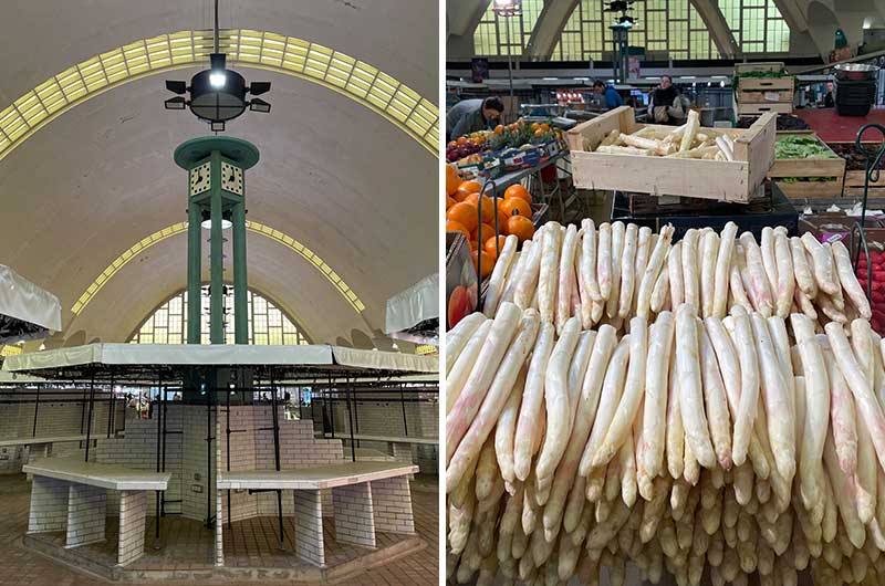 Den første morgenen i Reims spaserte vi fra hotellet til byens store innendørs matmarked, Halles du Boulingrin. Mathallen ble bygget i 1929, som en del av gjenoppbygging av byen etter ødeleggelsene under første verdenskrig. I dag er hallen en vernet historisk bygning med et livlig matmarked hver morgen. Her er det nok av kulinariske fristelser, blant annet hvit asparges som er i sesong i mai.