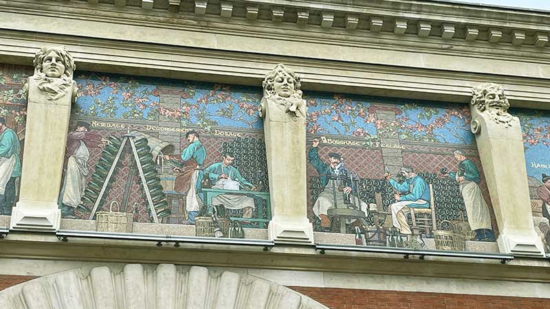 På vei tilbake til hotellet passert vi det tidligere hovedkontoret til Champagne Jacquart i Rue de Mars. Fasaden er i jugendstil og mosaikken øverst på veggen illustrerer de ulike stadiene av champagneproduksjonen.