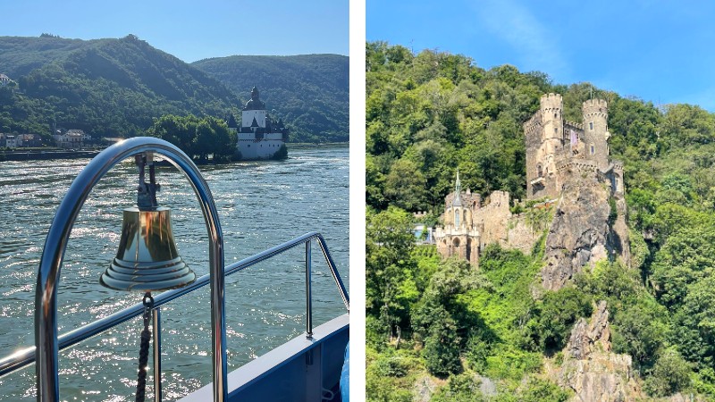 Skipsklokken ved tollstasjonen Kaub, og en av de mange slotts-ruinene i Rhindalen