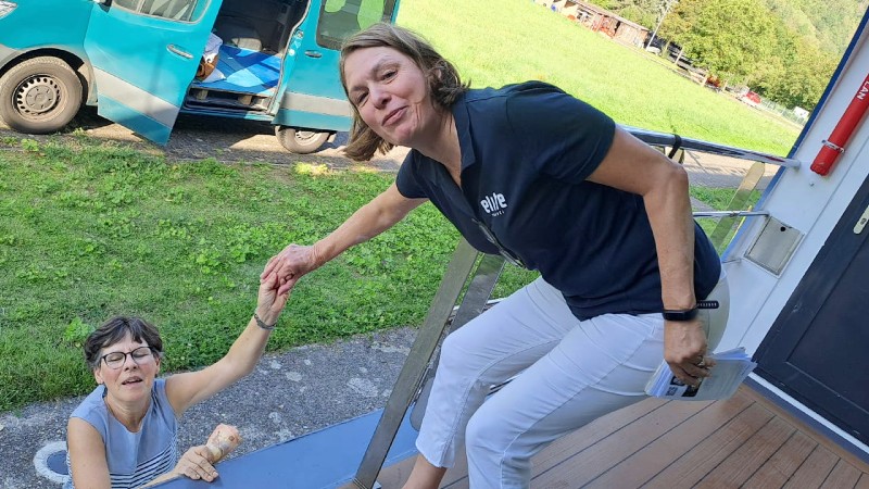 Vinbondekone Jutta leverer vin til vinsmaking. Noen ganger må hun levere mens båten er i slusen. Her var vi i siste liten, slusen er i ferd med å fylle seg, og Leonora er i ferd med å seile videre