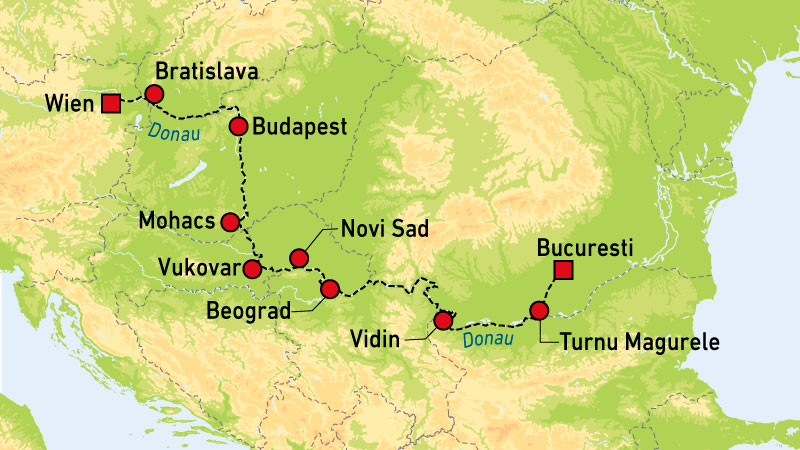 Seil på Donau, dronningen blant Europas elver, gjennom syv land; Østerrike, Slovakia, Ungarn, Kroatia, Serbia, Bulgaria og Romania. I tillegg besøker vi fem hovedsteder; Wien, Bratislava, Budapest, Beograd og Bucuresti. På vår ferd fra vest til øst, seiler vi gjennom naturskjønne områder og får et innblikk i landenes ulike kultur og spennende historie.