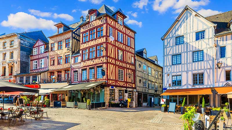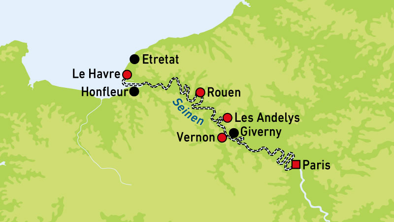 - Byvandring i Rouen: Rouen, hovedstaden i Normandie, er en av de vakreste middelalderbyene i Europa og åstedet for mange viktige historiske begivenheter. Høydepunktet på rundturen er kanskje byens imponerende gotiske katedral, udødeliggjort av den store impresjonisten Claude Monet i en serie på 28 malerier som viser fasaden til forskjellige tider av dagen og under ulike værforhold. Dere rusler forbi godt bevarte bindingsverkshus til den gamle markedsplassen, Place du Vieux-Marché. Her står det et stort kors som markerer stedet der Jeanne d'Arc ble brent på bålet i 1431.