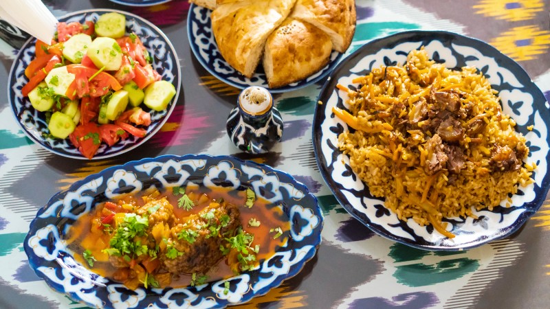 Sentralasiatisk mat er mangfoldig og smaksrik. Usbekisk mat er inspirert av både Midtøsten og det tyrkiske og russiske kjøkken. Yoghurt, tørket frukt, belgfrukter, frukteddik eller milde krydder som spisskummen gir smak til vanlige retter som lagman (håndlagde nudler), shashlyk (kebab), naan og nasjonalretten plov (risrett). Lam og kylling er de vanligste typene kjøtt. Den mest populære drikken til måltidene er chay (grønn te) og er tilgjengelig ved de fleste måltider.