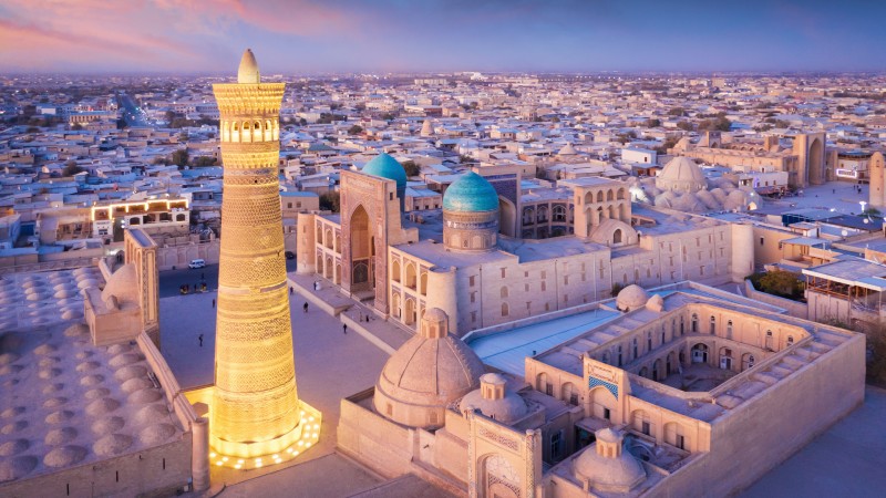 Samarkand og Bukhara i Usbekistan er de sterkest skinnende perlene på Silkeveien, handels-ruta som bant Kina til Midtøsten og Europa allerede for mange hundre år siden. Minaretene og madrasene (islam-skolene) er blant de mest utsmykkede og vakreste i verden.